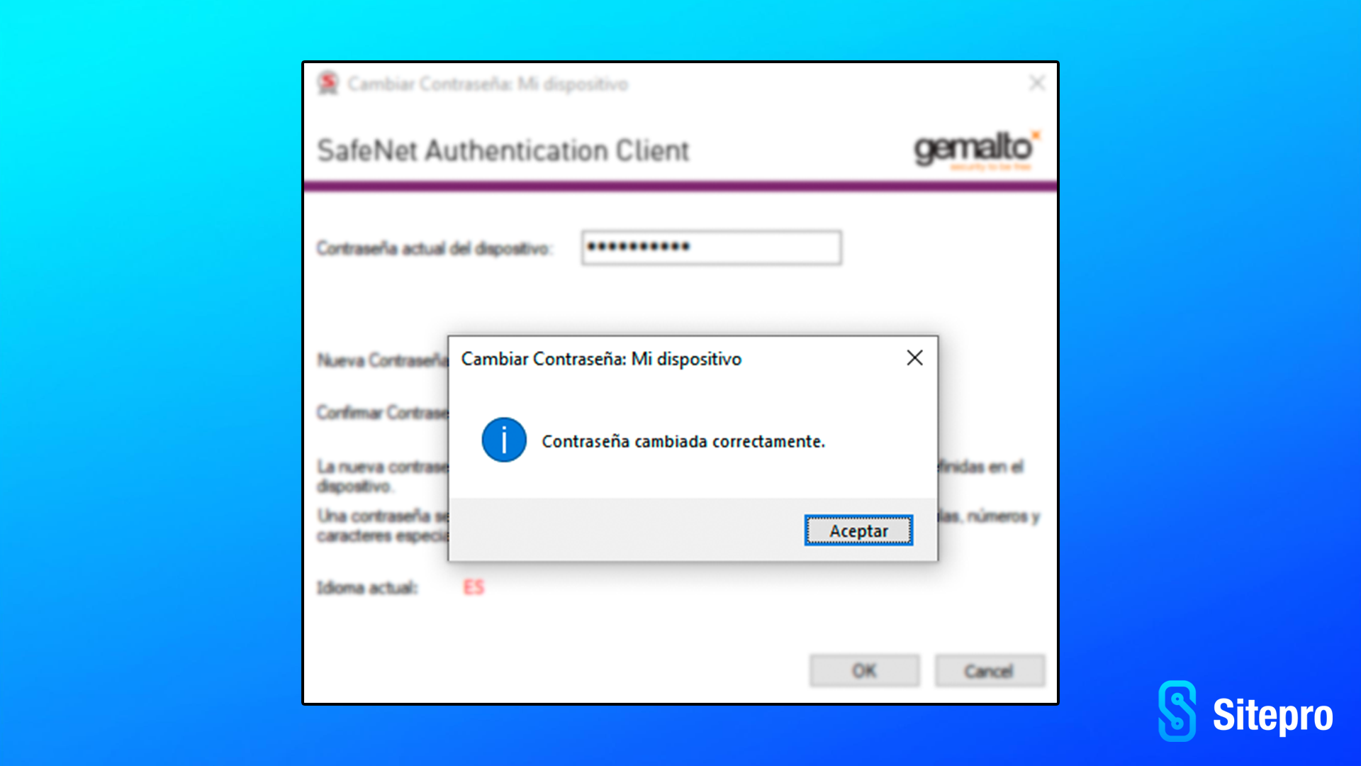 Todos los token SafeNet traen configurado de fabrica una única contraseña que es la que deberá ingresar en el recuadro de contraseña actual del dispositivo: 1234567890